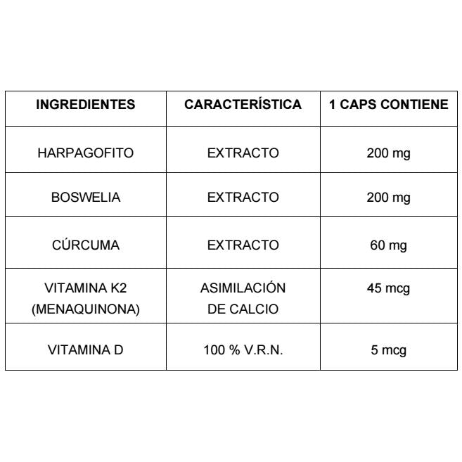 Extracto Harpagofito 200 mg. Extracto Boswelia 200 mg, Extracto Cúrcuma 60 mg. VItamina K2 (Menaquinona). 45 mcg 60% V.R.N. Vitamina D (Colecalciferol) 5 mcg 100% V.R.N.