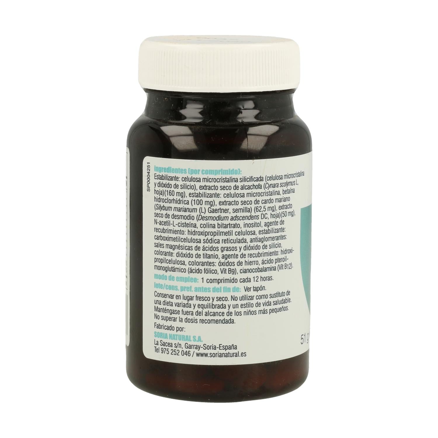 Por comprimido: Estabilizante: celulosa microcristalina, extracto seco de alcachofa (Cynara scolymus L, hoja) (160 mg), betaína hidroclorhídrica (100 mg), extracto seco de cardo mariano (Silybum marianum (L) Gaertner, parte aérea) (62,5 mg), extracto seco de desmodio (Desmodium adscendens DC, hoja) (50 mg), N-acetilL-cisteína, colina bitartrato, inositol, estabilizante: carboximetilcelulosa sódica reticulada, colorante: riboflavina, agente de recubrimiento: hidroxipropilmetil celulosa, antiaglomerantes: sales magnésicas de ácidos grasos y dióxido de silicio, agente de recubrimiento: isomaltosa, colorantes: carbonato de calcio y carmín, ácido pteroilmonoglutámico (ácido fólico, Vit. B9), cianocobalamina (Vit B12).