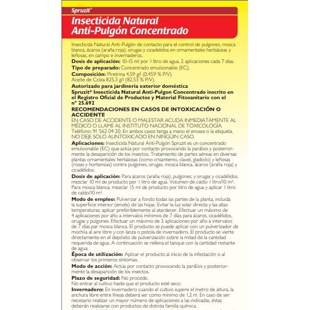 - Sustancias activas: 4,59 g/L de piretrina, proveniente de las flores del Chrysanthemum cinerariaefolium, y 825,3 g/L de aceite de colza.