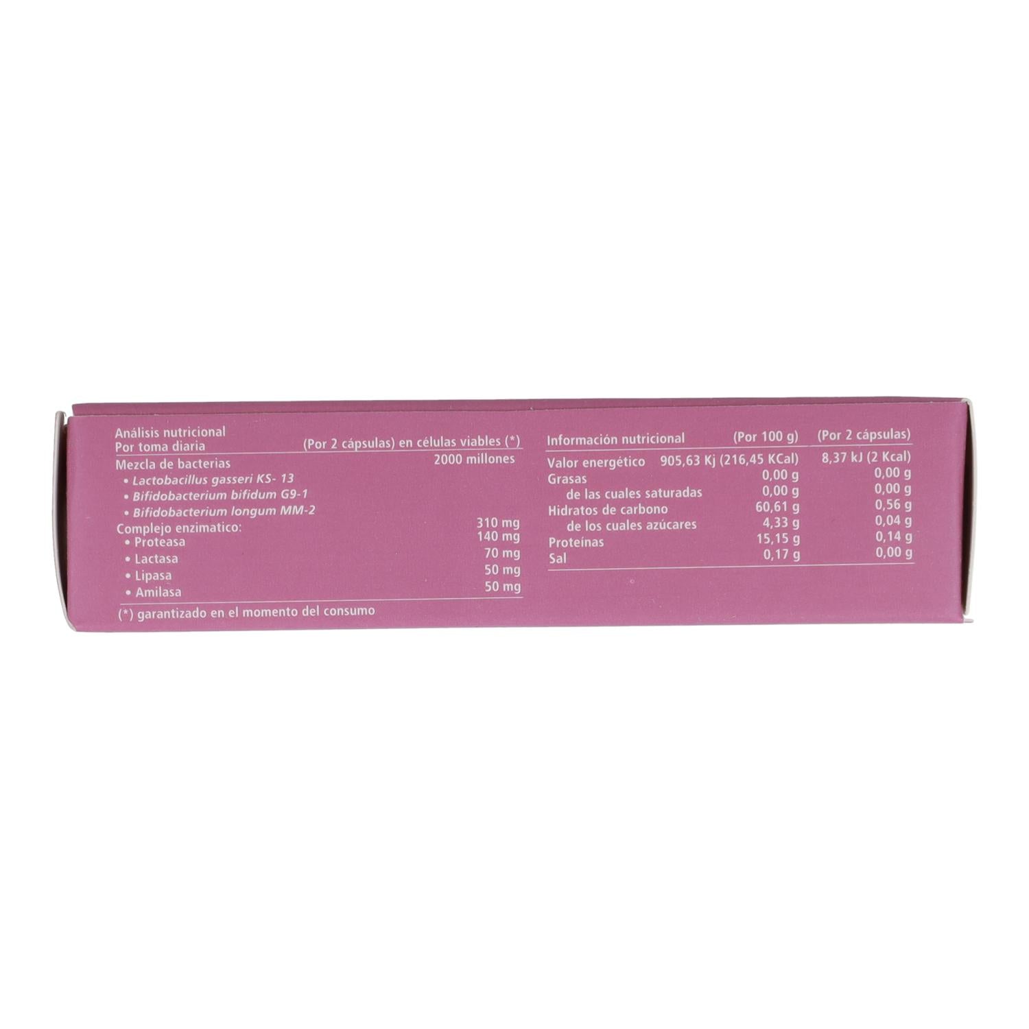 Es una combinación de tres cepas bacterianas presentes en el intestino humano (Lactobacillus gasseri, Bifidobacterium bifidum y Bifidobacterium longum) con cuatro enzimas digestivas (lipasa, lactasa, proteasa y amilasa), que contribuyen a favorecer la digestión y regenerar la flora intestinal beneficiosa.