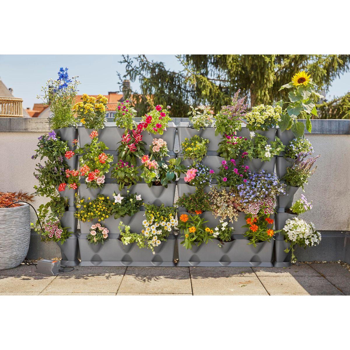 Es un sistema flexible para llenar tus muros flores, verduras y hortalizas de forma rápida y sencilla. El sistema de conexión con las jardineras resiste a las inclemencias del tiempo es modular, extensible y se puede conectar sin usar herramientas.