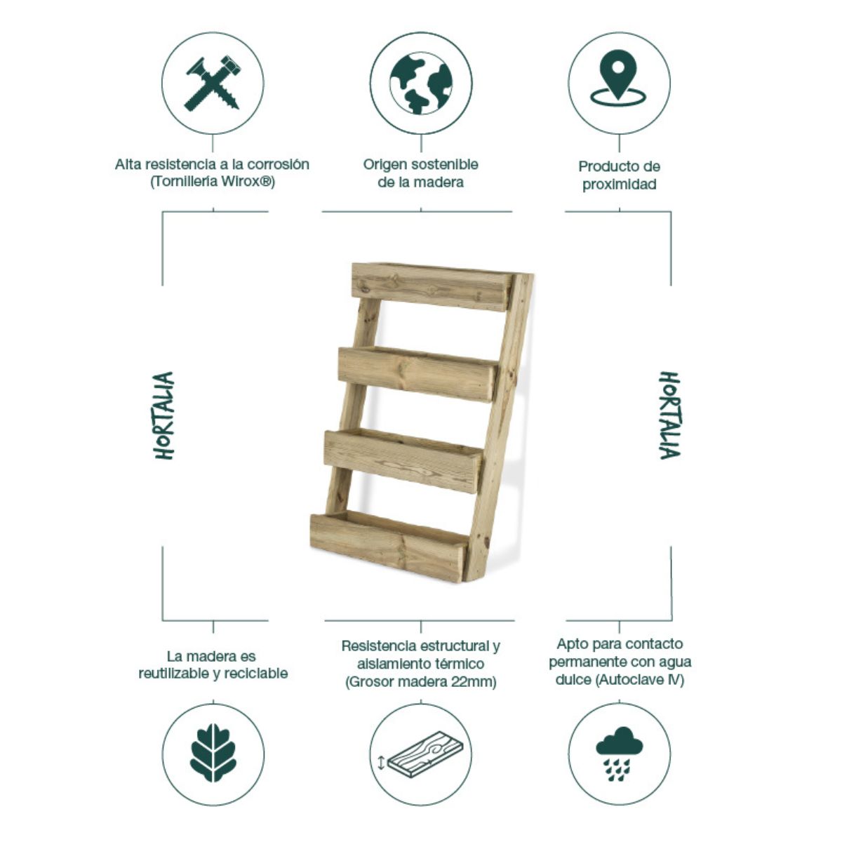 Estructura para apoyar en la pared, de madera de alta calidad que destaca por su estética y versatilidad bien como recipiente para huertos urbanos en espacios pequeños o como ubicación de un jardín florido en un rincón de la terraza de casa.