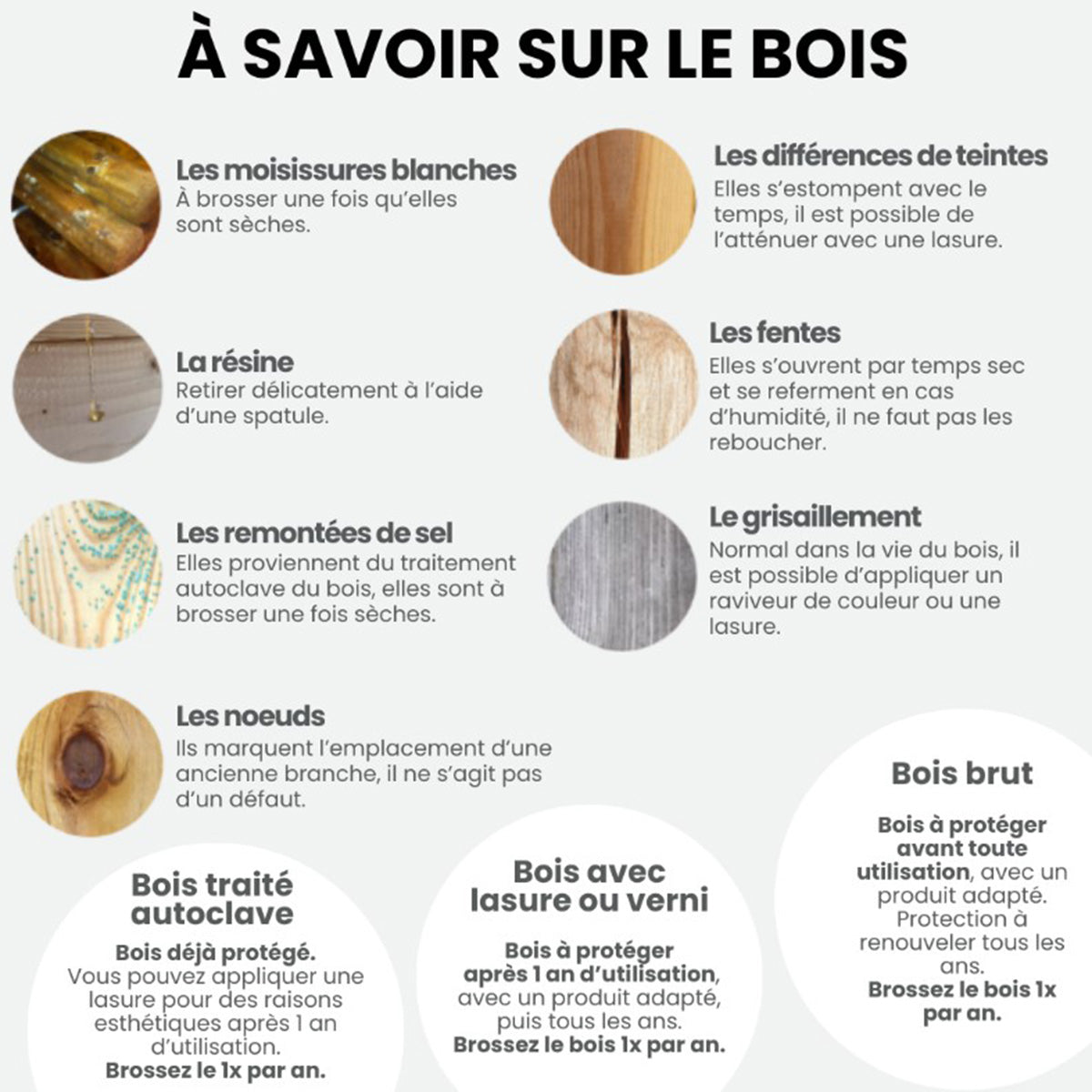Madera ya protegida. Por razones estéticas se puede aplicar un tintey/o lasur, pero no antes de un año de uso. Limpiar con un cepillo una vez al año