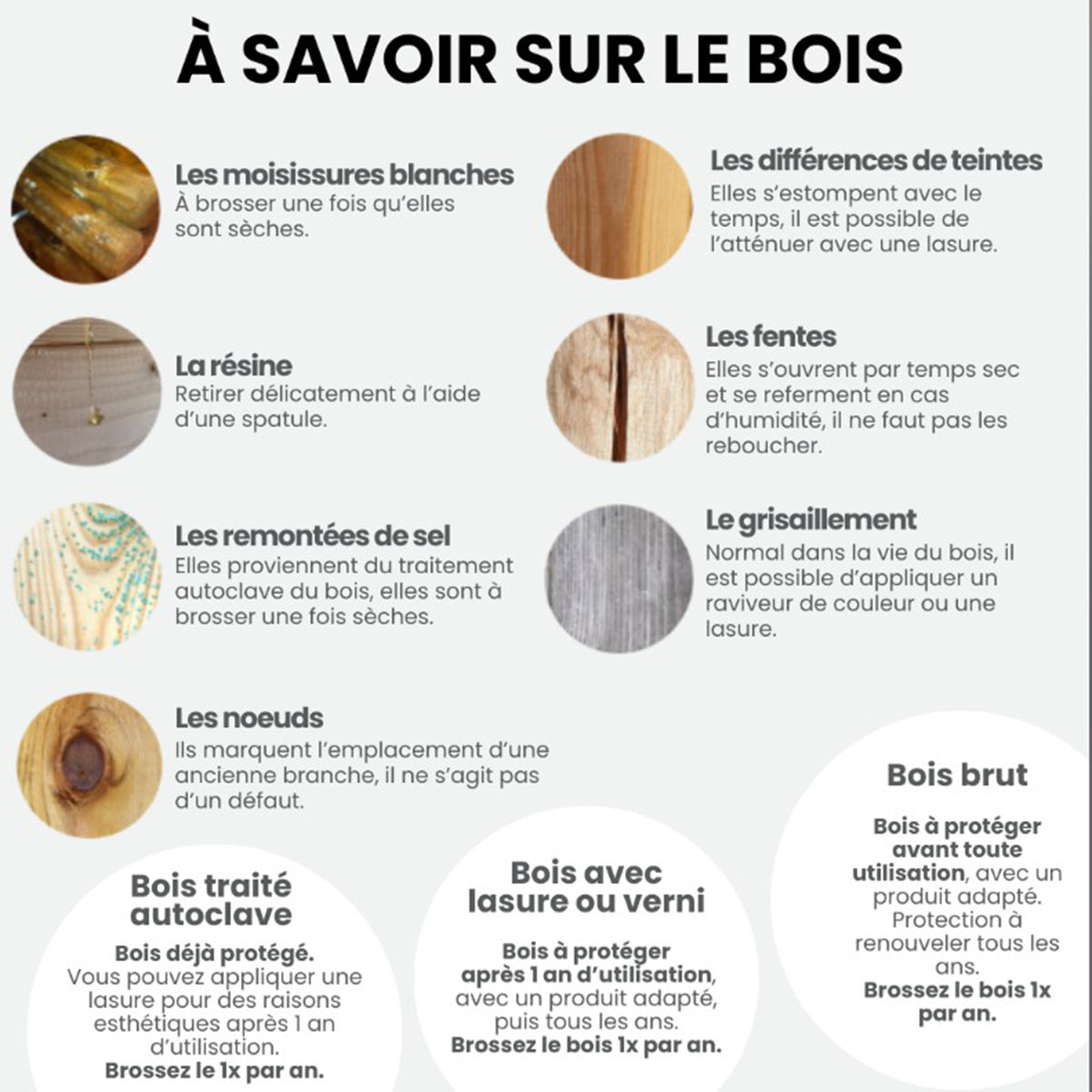 Madera ya protegida. Por razones estéticas se puede aplicar un tintey/o lasur, pero no antes de un año de uso. Limpiar con un cepillo una vez al año