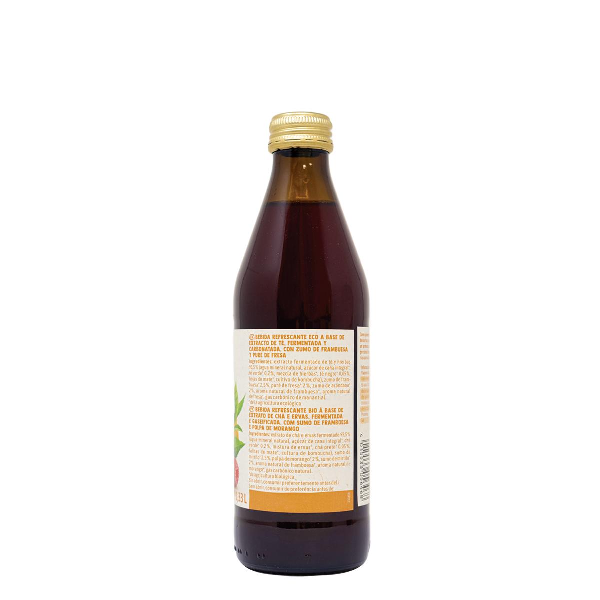 Extracto fermentado de té y hierbas 93,5% (agua mineral natural, azúcar de caña integral*, té verde* 0,2%, mezcla de hierbas*, té negro* 0,05%, hojas de mate*, cultivo de kombucha), zumo de frambuesa*2,5%, puré de fresa*2%, zumo de arándano* 2%, aroma natural de frambuesa*, aroma natural de fresa*, gas carbónico de manantial.