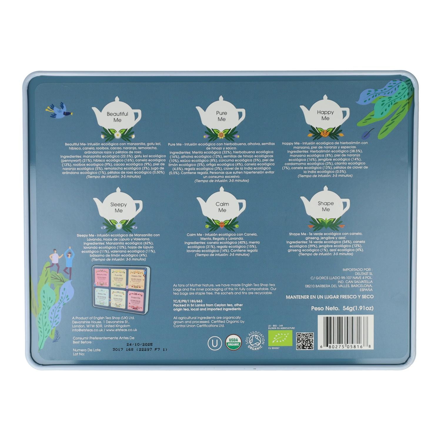Una colección de 6 variedades de infusiones en una bonita lata regalo. Contiene: Beautiful me, Pure me, Happy me, Sleepy me, Calm me, Shape me. Infusiones de origen ecológico