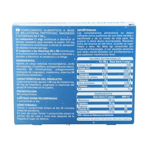 Ingredientes: Agente de carga (celulosa microcristalina), óxido de magnesio, L- triptófano, antiaglomerante (talco), vitamina B3 (nicotinamida), antiaglomerante (estearato de magnesio), melatonina, vitamina B6 (piridoxina clorhidrato).