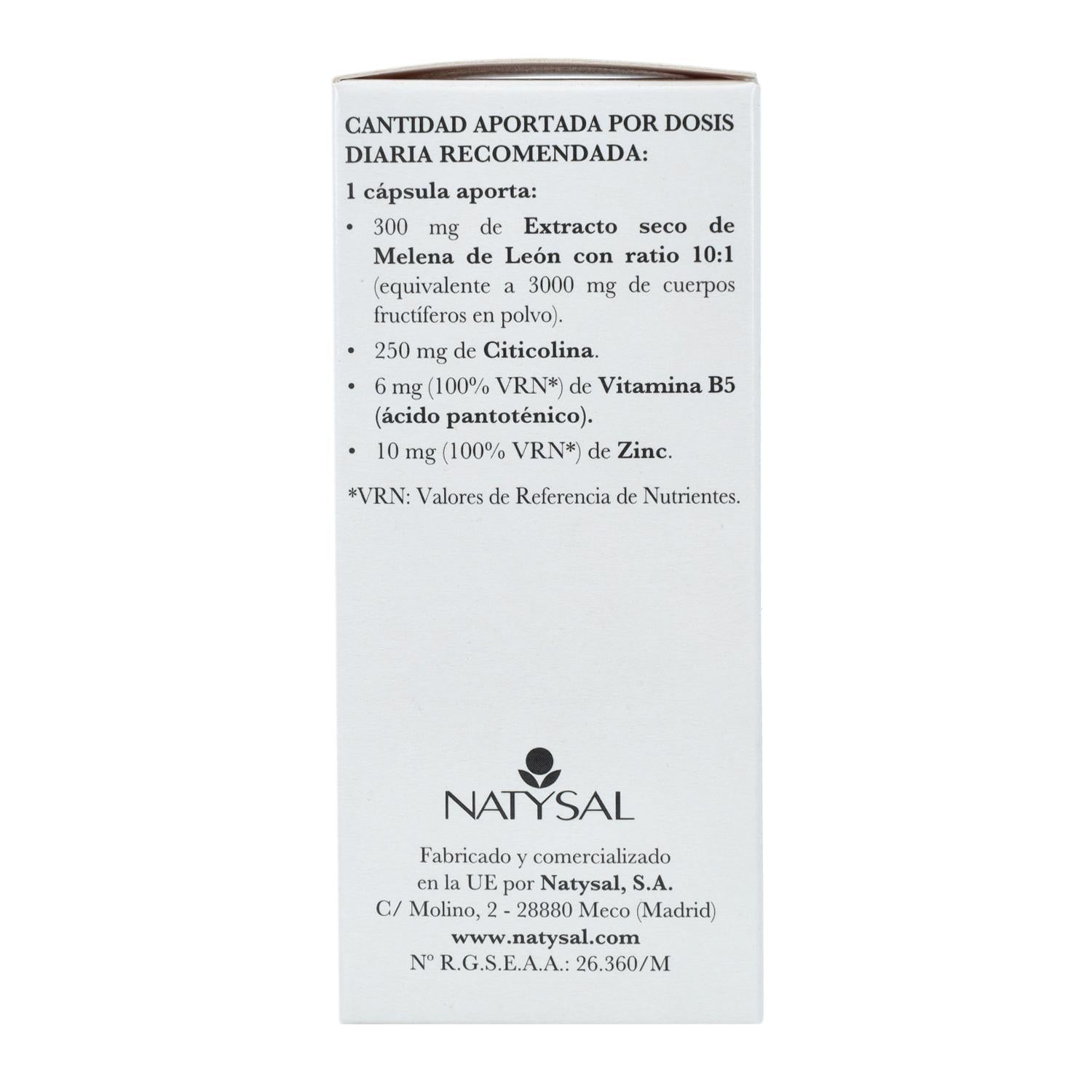 Extracto seco de cuerpos fructíferos de melena de león (Hericium erinaceus) con ratio 10:1, citicolina, agente de recubrimiento hidroxipropilmetilcelulosa, gluconato de zinc, agente de carga celulosa microcristalina, antiaglomerante estearato magnésico, D-pantotenato cálcico.