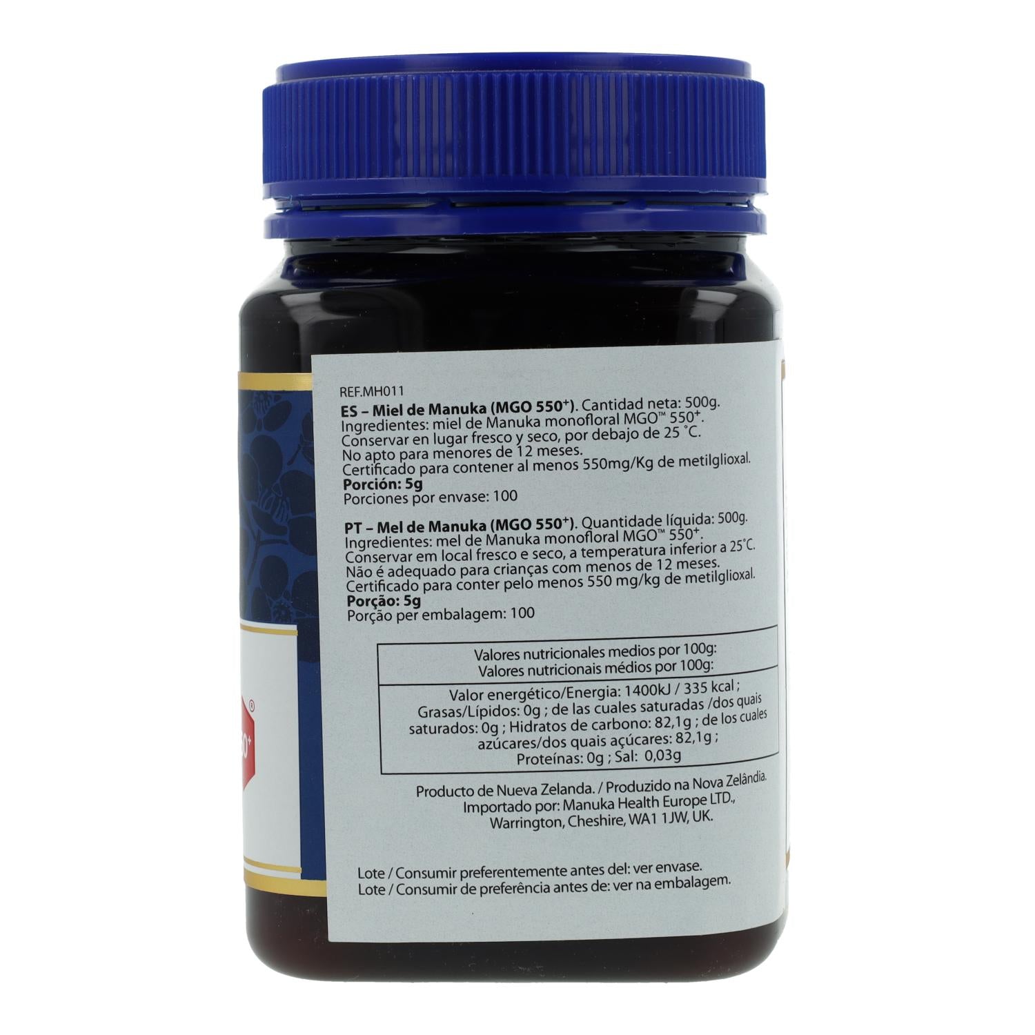 Ingredientes: Miel de Manuka monofloral MGOTM 550+. Certificado para contener al menos 550mg/Kg de metilglioxal.