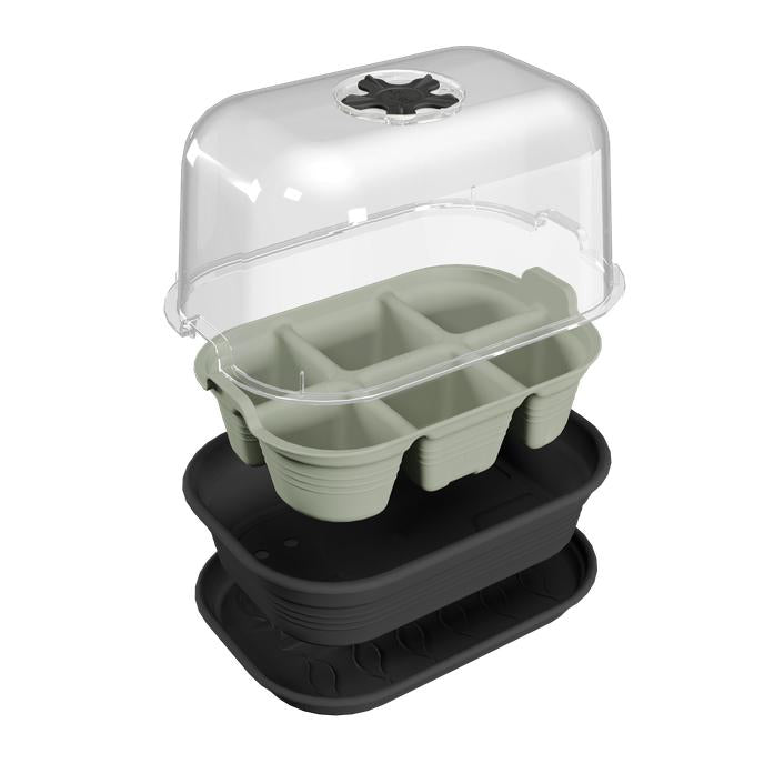 El set incluye una casa de cultivo green basics que puedes colocar encima de la bandeja de cultivo para crear un miniinvernadero. Un panel de ventilación deslizante te ayuda a garantizar que tus plantas tengan la temperatura y ventilación adecuadas.