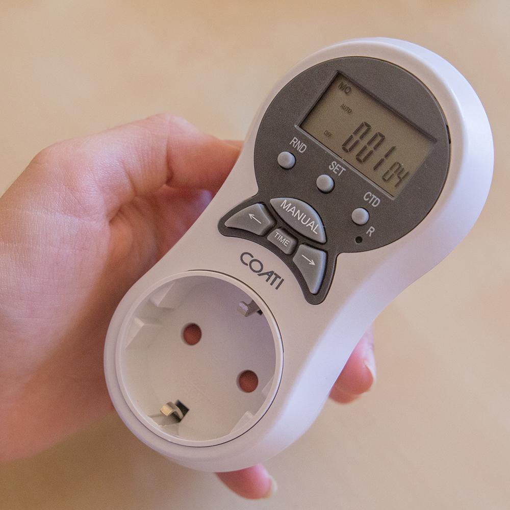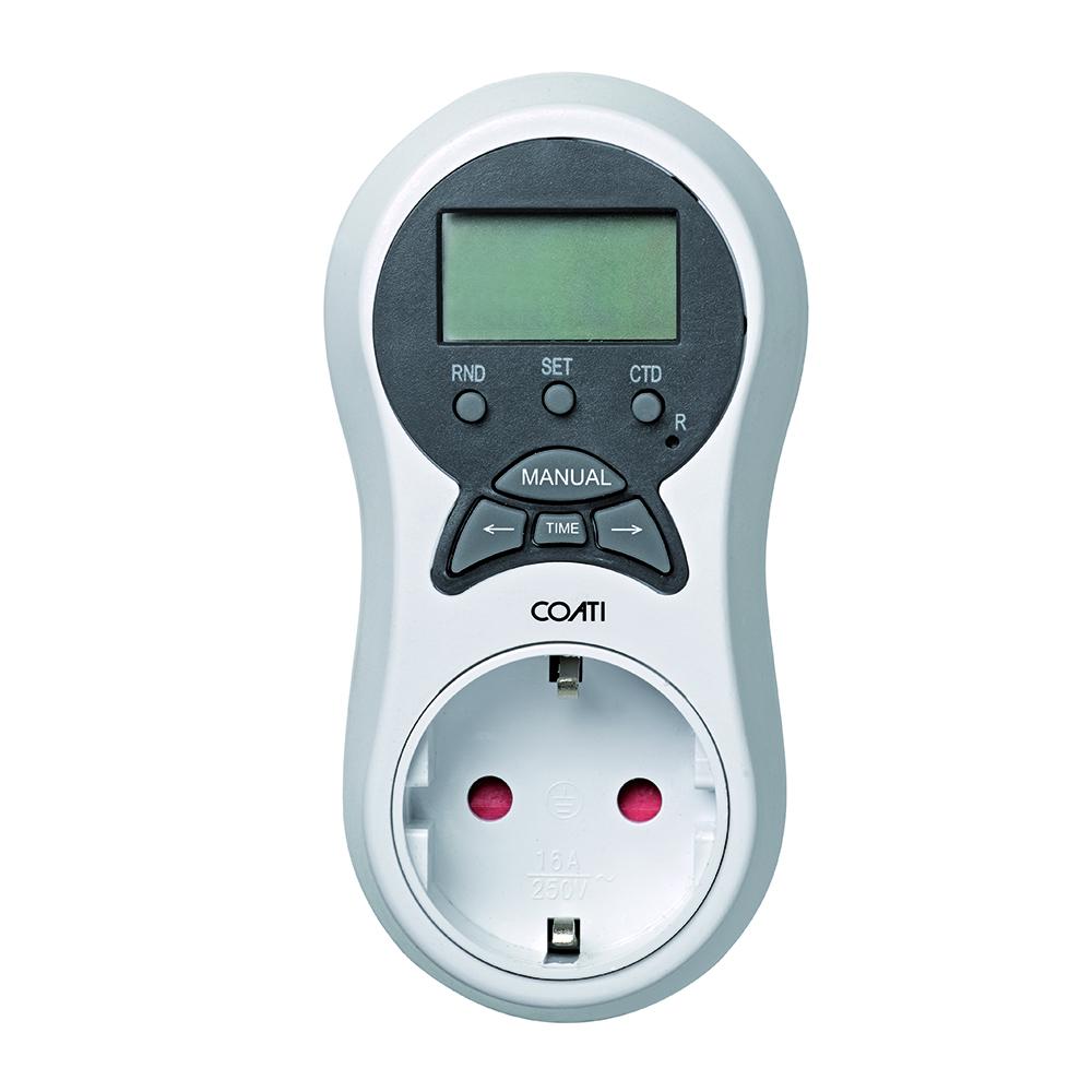 Programador digital de configuración semanal de reducidas dimensiones acabado en grafito. El temporizador COATI dispone de 20 programas con opción a 15 combinaciones semanales y un intervalo de conmutación de 1 minuto. También ofrece una serie de funciones extras como la cuenta atrás para el funcionamiento de los elementos conectados, la función random para simular presencia en el hogar durante las vacaciones, la función verano para adaptar la hora al nuevo horario rápidamente, la función reset y función 12/24 para cambiar el formato de hora.