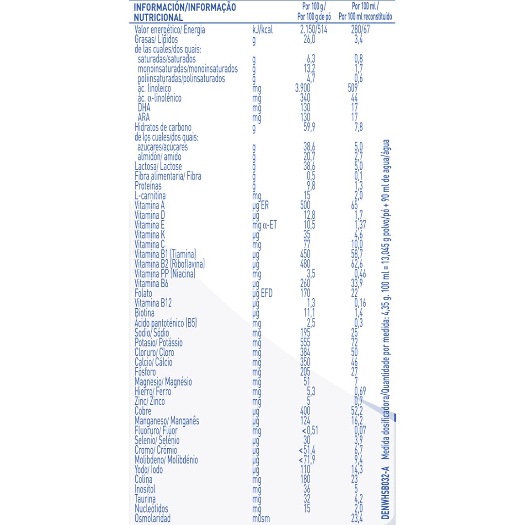Lactosa, aceites vegatales (girasol, coco, nabina y de Mortierella alpina), almidón de patata, proteínas de suero de leche hidrolizadas parcial y enzimáticamente, sales minerales (citrato potásico, glicerofosfato álcio, fosfato cálcido, cloruto de magnesio, cloruro cálcico, cloruro sódico, sulfato ferroso, sulfato de zinc, sulfato cúprico, sulfato de manganeso, yoduro pótasico, seleniato sódico), aceite de pescado (DHA), colina, Lárginina, corrector de acidez (ácido cítrico), vitaminas (C,A,B3,B5,A,B1,B2,B6, ácido folico, K,D,biotina, B12), L-histidina, L-tirosina, cultivos de Limosilactobacillus reuteri (dsm 17938), taurina, inositol, nucleótidos, L-carnitina.