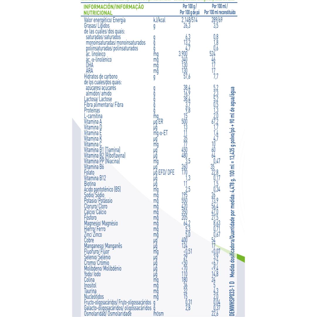 Lactosa, aceites vegetales girasol alto oleico, coco, nabina, girasol y de Mortierella alpina rico en ARA), almidón de patata, proteínas de suero de leche hidrolizadas parcial y enzimáticamente, galacto-oligosacáridos (contienen leche), sales minerales (citrato potásico, glicerofosfato cálcico, cloruro de magnesio, fosfato cálcico, cloruro cálcico, cloruro sódico, sulfato ferroso, sulfato de zinc, sulfato cúprico, sulfato de manganeso, yoduro potásico y seleniato sódico, aceite de pescado (DHA), colina, fructo-oligosacáricos, L-arginina, corrector de acidez (ácido cítrico), vitaminas (C, E, B3, B5, A, B1, B2, B6, ácido fólico, K, D, biotina y B12) L-tirosina, fermentos lácticos (cultivos de Limosilactobacilus reuteri (DSM17938), taurina, inositol, nucleótidos (citidina, uridina, adenosina y guanosina) y L-carnitina.
