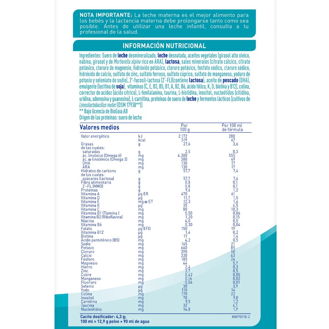 Suero de leche desmineralizado, leche desnatada, aceites vegetales (nabina, coco y girasol), proteínas de leche, lactosa, sales minerales (citrato cálcico, hidróxido potásico, citrato potásico, cloruro de magnesio, cloruro sódico, cloruro potásico, fosfato sódico, hidróxido de calcio, sulfato de zinc, sulfato ferroso, sulfato cúprico, sulfato de manganeso, seleniato de sodio y yoduro de potasio), 2′-O-fucosil-lactosa (2’-FL), aceite de pescado, emulgente (lecitina de soja), vitaminas (L-ascorbato sódico, DL-alfa acetato de tocoferol, acetato de retinol, nicotinamida, filoquinona, D-pantotenato cálcico, colecalciferol, mononitrato de tiamina, clorhidrato de piridoxina, riboflavina, ácido fólico, cianocobalamina y D-biotina), colina, taurina, inositol, L-fenilalanina, L-histidina, nucleótidos (citidina, uridina, adenosina y guanosina), L-carnitina y fermentos lácticos [cultivos de Lactobacillus reuteri (DSM 17938**)].