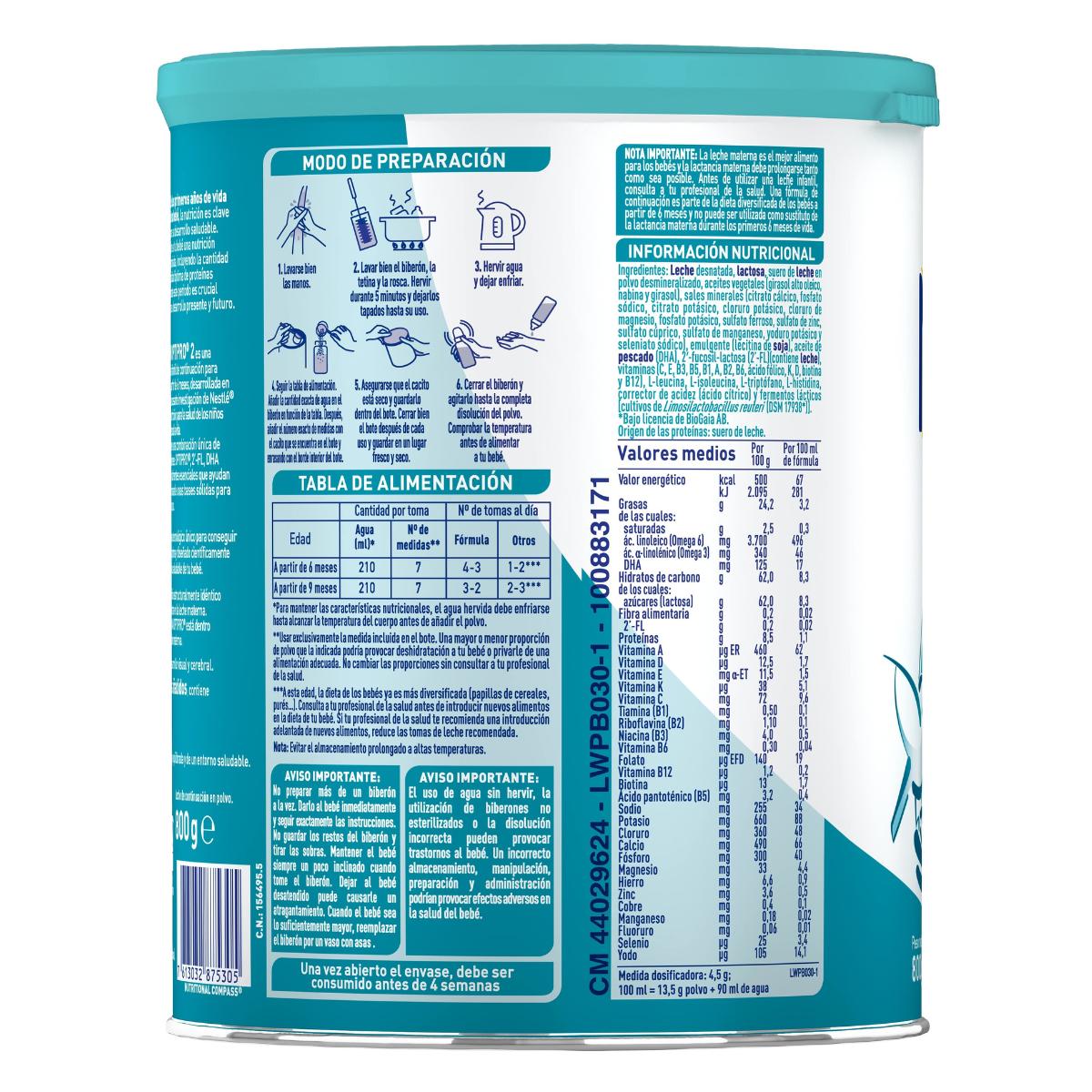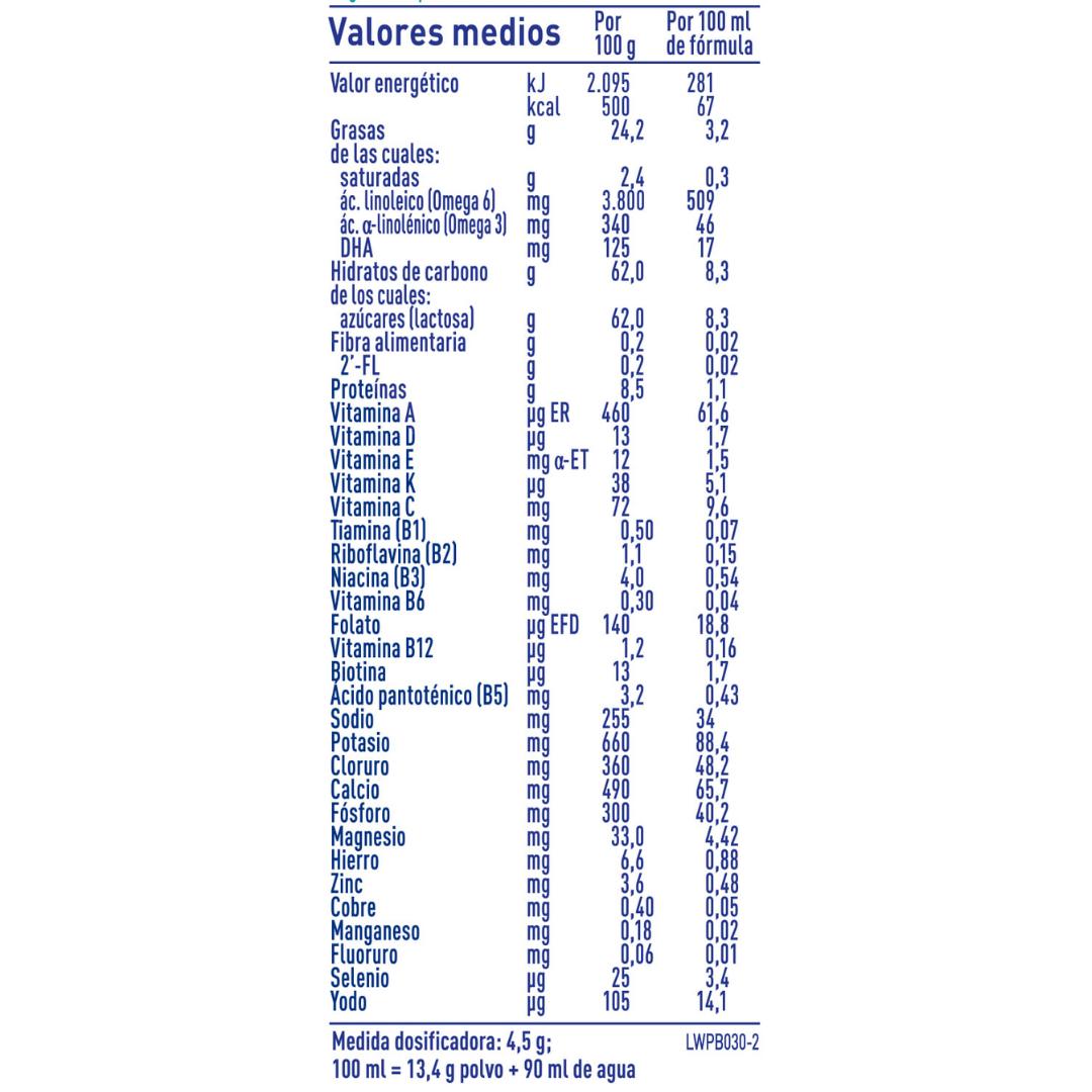 Leche desnatada, lactosa, suero de leche en polvo, aceites vegetales (girasol alto oleico, coco, nabina y girasol), sales minerales (citrato cálcico, fosfato sódico, citrato potásico, cloruro potásico, cloruro de magnesio, fosfato potásico, sulfato ferroso, sulfato de zinc, sulfato cúprico, sulfato de manganeso, yoduro potásico y seleniato sódico), emulgente (lecitina de soja), aceite de pescado (DHA), 2'-fucosil-lactosa (2?-FL)(contiene leche), vitaminas (C, E, B3, B5, B1, A, B2, B6, ácido fólico, K, D, biotina y B12), L-fenilalanina, L-leucina, L-isoleucina, L-triptófano, L-histidina, corrector de acidez (ácido cítrico) y fermentos lácticos [cultivos de Lactobacillus reuteri (DSM 17938*)]. *Bajo licencia de BioGaia AB.
