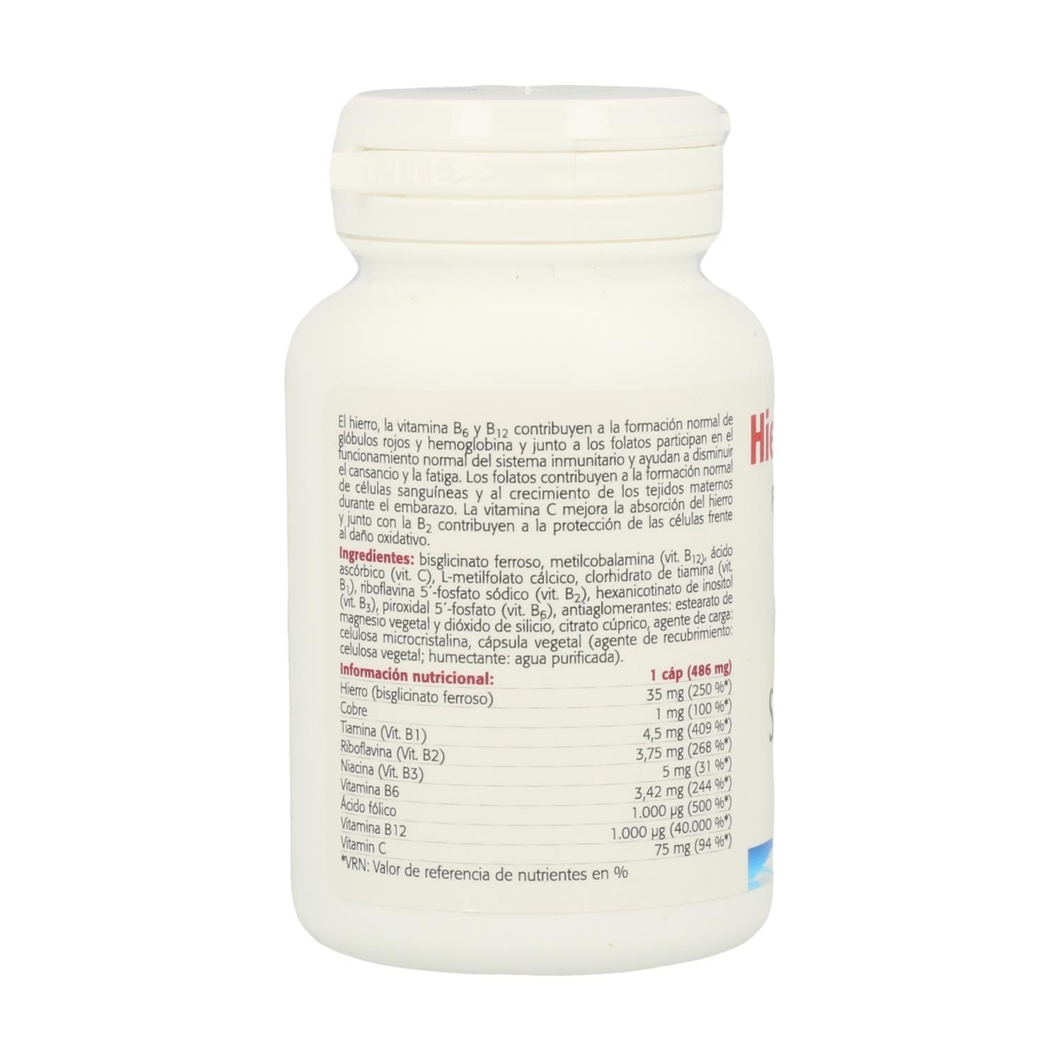 Ingredientes:agente de carga (celulosa microcristalina), bisglicinato ferroso, ácido L-ascórbico (vit. C), L-metilfolatocálcico, metilcobalamina (vit. B12), antiaglomerantes (estearato de magnesio vegetal y dióxido de silicio), clorhidrato de tiamina (vit. B1), riboflavina 5´-fosfato sódico (vit. B2), hexanicotinato de inositol (vit. B3), piridoxal 5´-fosfato (vit. B6), citrato cúprico, cápsula vegetal (agente de recubrimiento: hidroxipropilmetilcelulosa; humectante: agua purificada). | ||