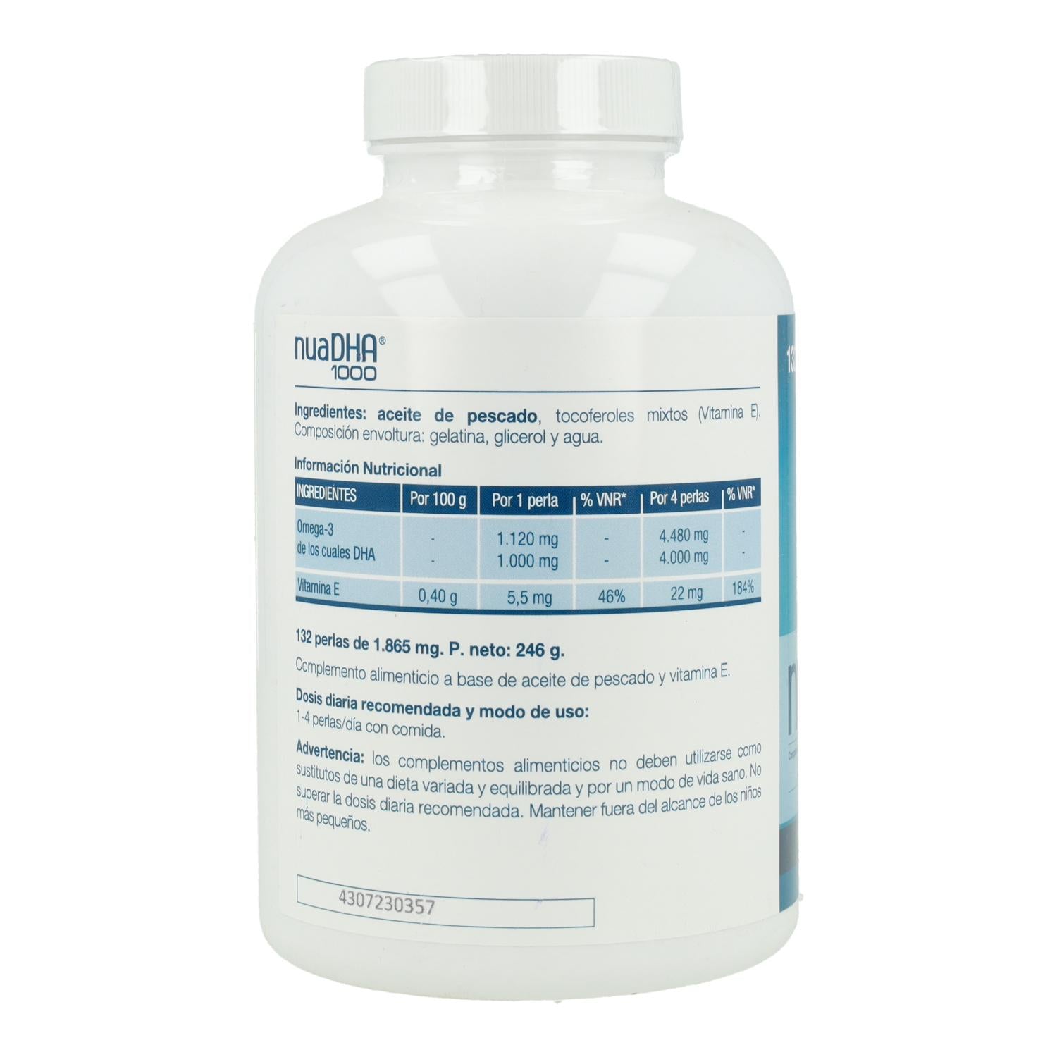 La incorporación de un ácido omega-3 a nuestro organismo a través de un suplemento requiere que el ácido graso en cuestión (ej. DHA), vaya unido a un ‘vehículo’. Una perla de NuaDHA 1000 contiene aprox. 1.125 mg de DHA-TG es decir, DHA “como triglicérido” (esto es, incluyendo el vehículo al que el DHA va unido y que facilita su asimilación). Sin embargo, descontando dicho vehículo, habría cerca de 1.050 mg de DHA libre o puro/perla.