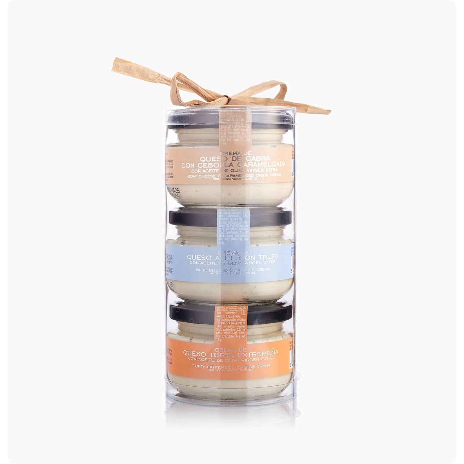 - Incluye: Crema de Queso de Cabra con cebolla caramelizada, con la Crema de Queso azul con trufa y con la Crema de Queso torta extremeña.
