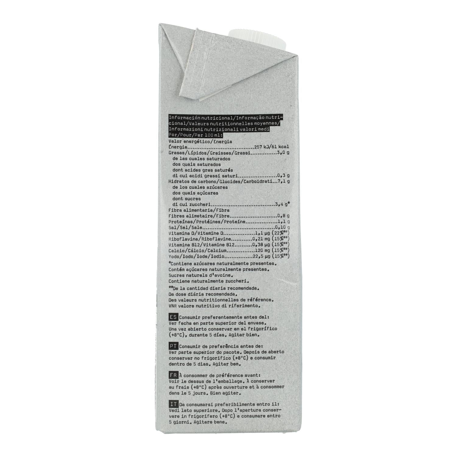 Ingredientes: Base de avena (agua, avena 10%), aceite de colza, regulador de acidez (fosfato dipotácico), carbonato de calcio, fosfatos de calcio, sal yodada, vitaminas (D2, riboflavina, B12)