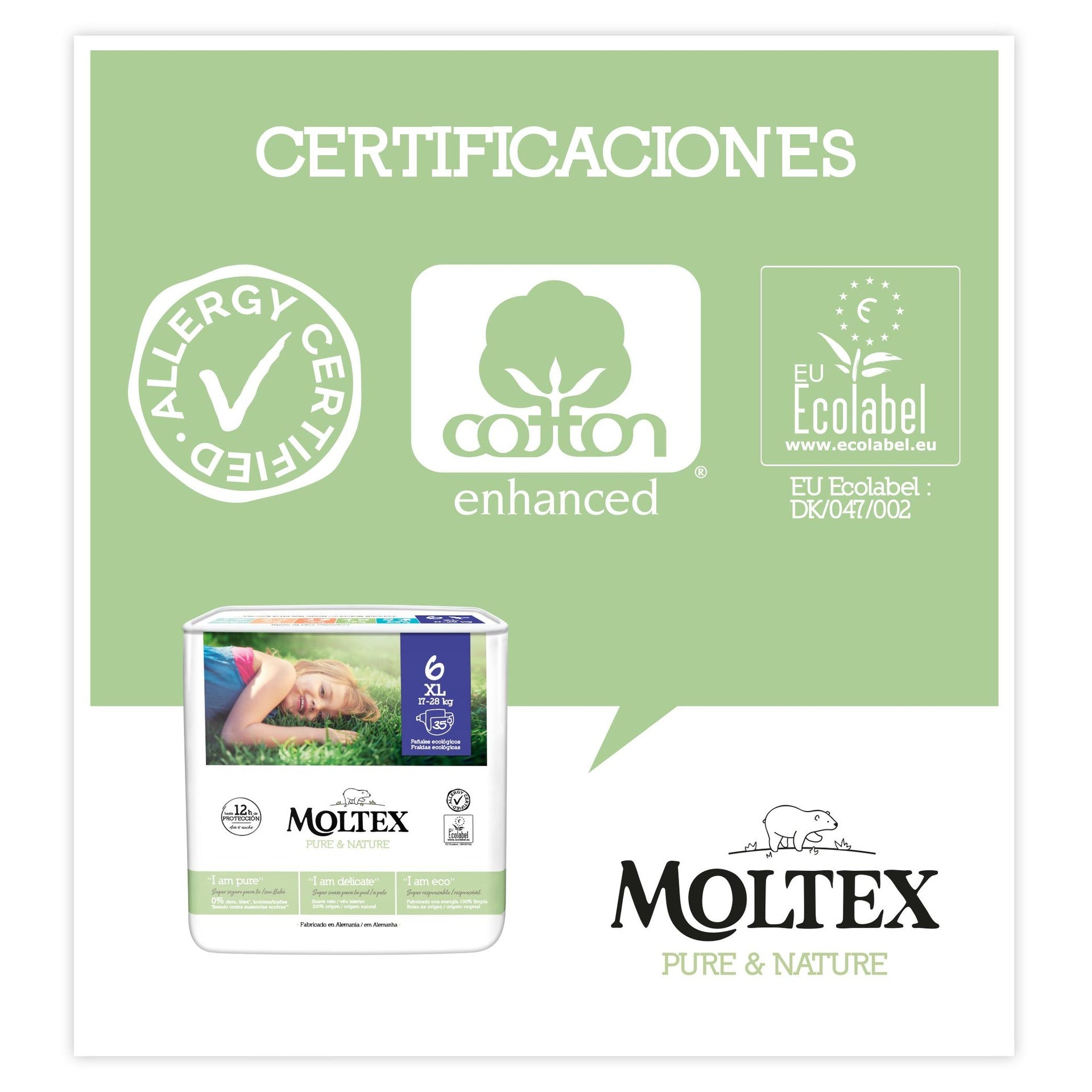 Todos estos beneficios están testados y certificados por organismos independientes con sellos de calidad internacional. Moltex Pure & Nature es el pañal más seguro para tu bebé y el planeta.