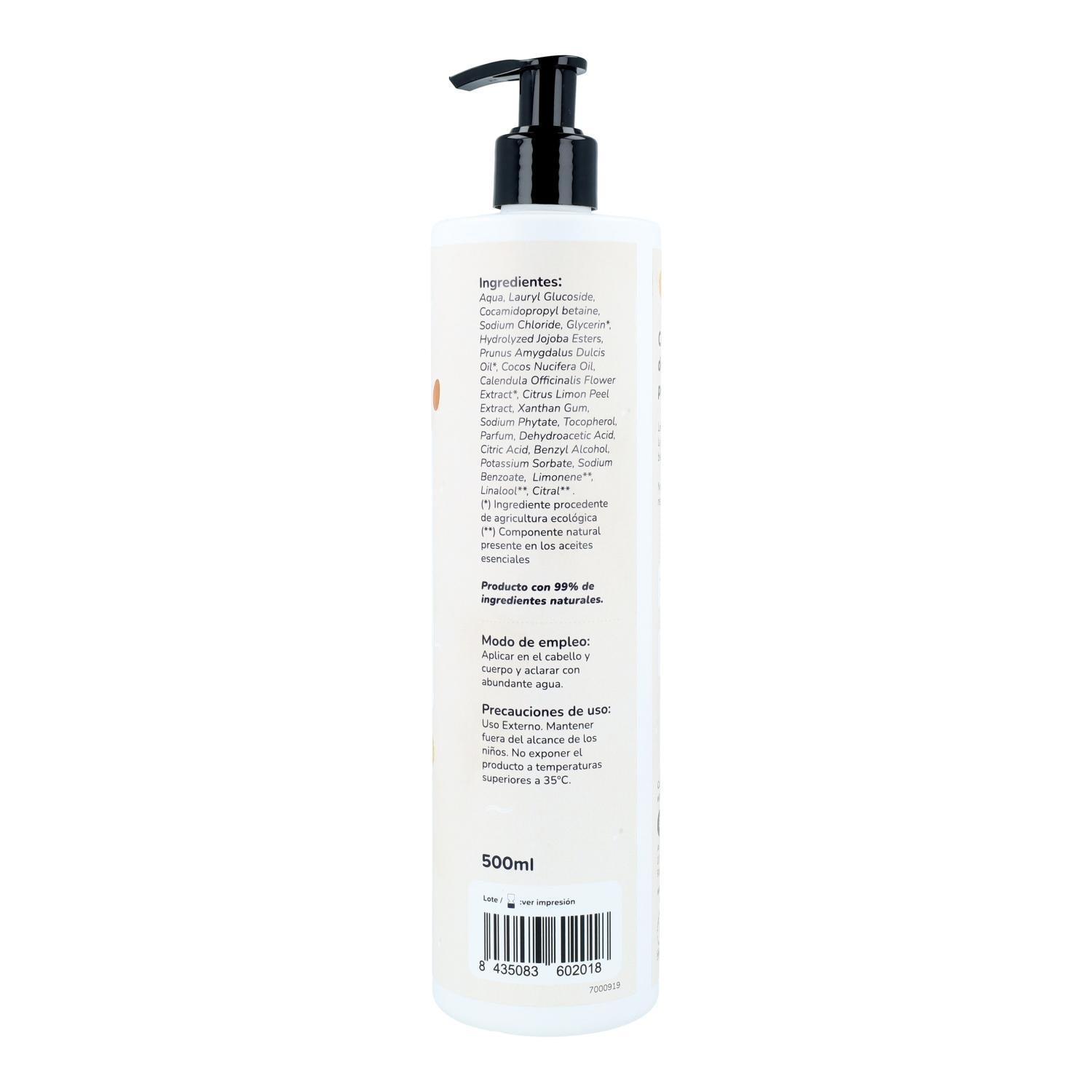 INCI: Aqua, Lauryl Glucoside, Cocamidopropyl Betaine, Aloe Barbadensis Leaf Juice*, Sodium Chloride, Glycerin*, Prunus Amygdalus Dulcis Oil*, Cocos Nucifera Oil*, Calendula Officinalis Flower Extract*, Citrus Limon Peel Extract, Tocopherol, Hydrolyzed Jojoba Esters, Parfum, Xanthan Gum, Sodium Phytate, Benzyl Alcohol, Dehydroacetic Acid, Citric Acid, Potassium Sorbate, Sodium Benzoate, Limonene**, Citral** (*) Ingrediente procedente de agricultura ecológica (**) Componente natural presente en los aceites esenciales Producto natural con un 19% de ingredientes ecológicos.