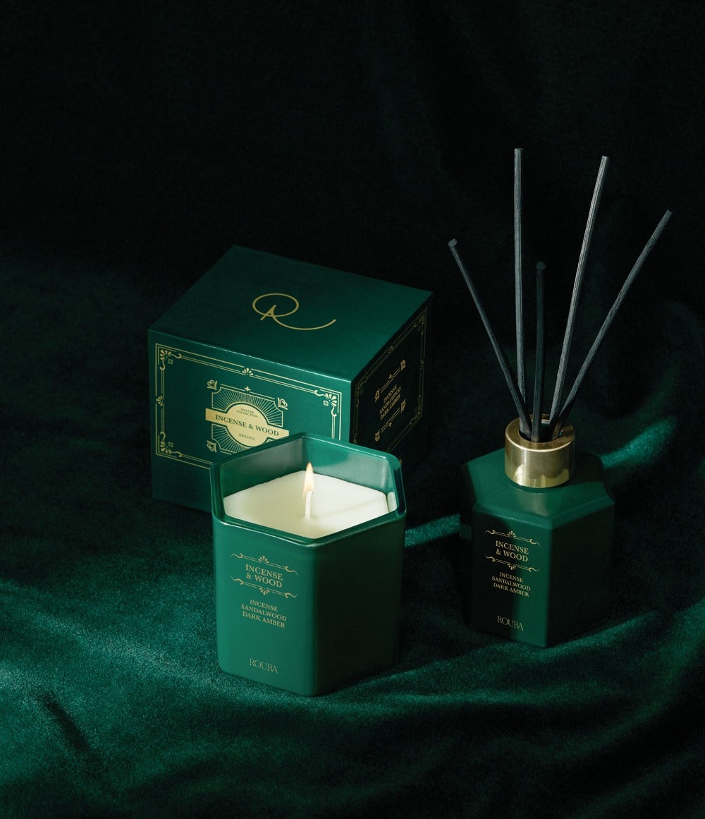 Pack vela y ambientador Incense & Wood Roura Incienso, madera de sándalo & Dark Amber