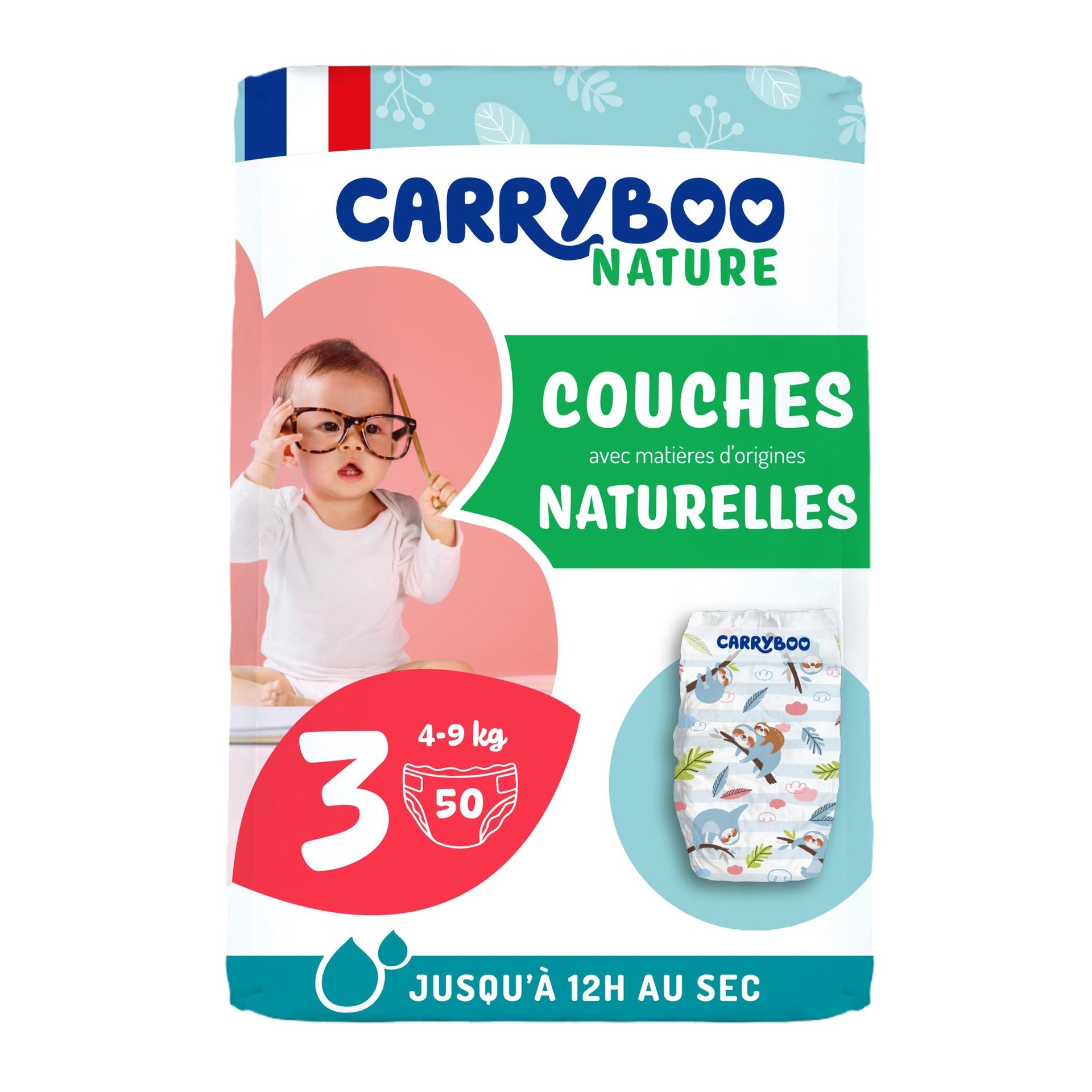 Pañales sanos para el bebé... Los pañales Carryboo Nature están fabricados con un vellón 100% natural y están garantizados sin cloro, sin perfume, sin loción, sin petrolato y sin OGM. Para un culito seco en el que puedes confiar. Y como la confianza no excluye el control, nuestros productos son analizados por laboratorios independientes para certificar la ausencia de más de 200 sustancias nocivas. Y todo ello, ¡manteniéndose seco hasta 12 horas, día y noche!