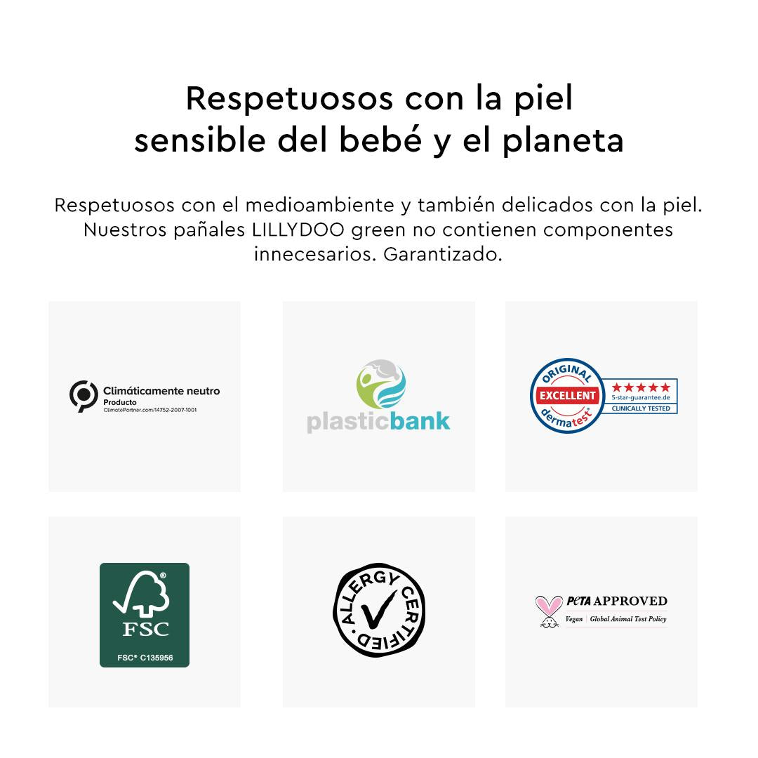 - MADE IN GREEN de OEKO-TEX® garantiza que los pañales de LILLYDOO han pasado por un control de sustancias y productos químicos nocivos para la salud. Al mismo tiempo, que su producción se lleva a cabo en fábricas respetuosas con el medio ambiente con lugares seguros y socialmente responsables.