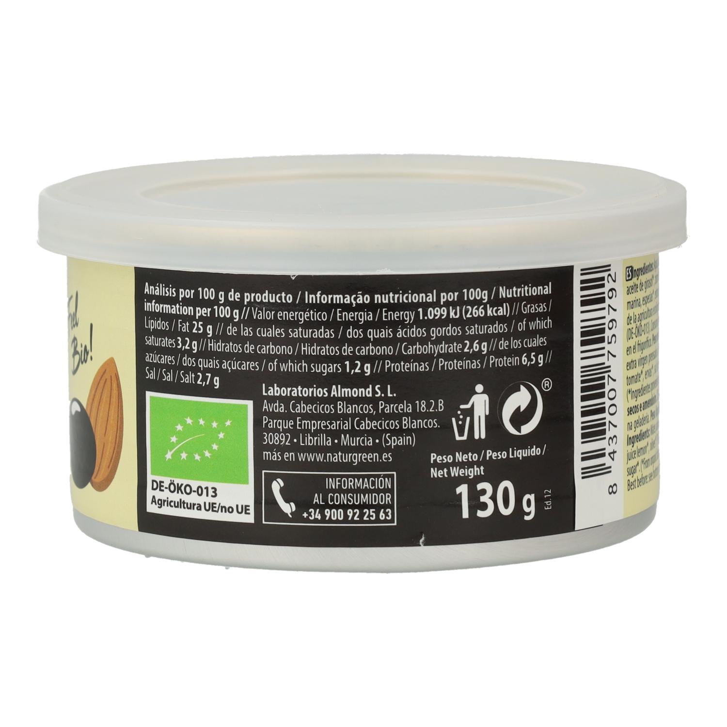 Ingredientes: Agua, almendra*(13%), aceite de oliva extra virgen prensado en frío*(12%), aceite de girasol*, olivas*(7%), tomate*, zumo de limón*, cebolla*, hierbas aromáticas*, sal marina, especias*, azúcar moreno de caña*. *Ingredientes procedentes de la Agricultura Ecológica. No contiene grasas hidrogenadas (libre de ácidos grasos Trans).