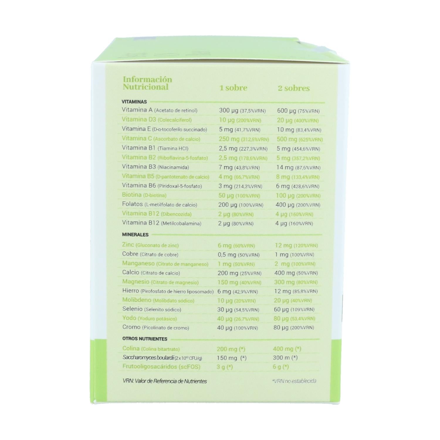 Aporta vitaminas en “forma activa” y minerales en su forma más biodisponible. Es fuente de fibra, porque aporta una cantidad efectiva de fructooligosacáridos (3g/sobre). S.boulardii apoya las funciones de todos los otros micronutrientes y ayuda a su mejor absorción intestinal.