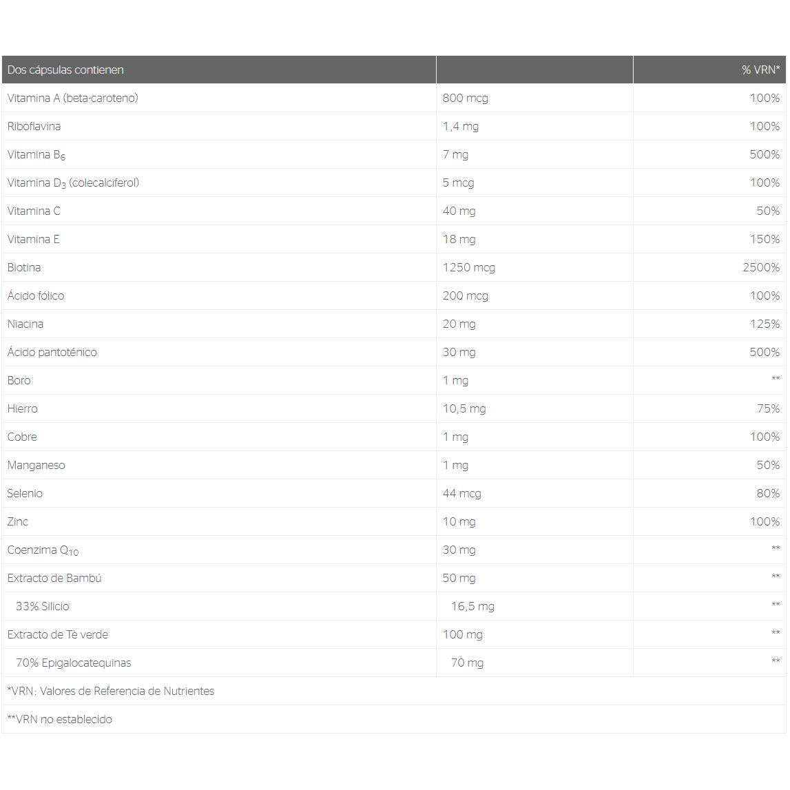 Extracto de Té verde (Camellia sinensis), agente de recubrimiento (hidroxipropilmetilcelulosa), picolinato de zinc, citrato de hierro, extracto de Bambú (Bambusa vulgaris), ácido L-ascórbico, D-pantotenato cálcico, coenzima Q-10 (Kaneka Q10), agente de carga (celulosa microcristalina), succinato ácido de D-alfa tocoferilo, nicotinamida, beta-caroteno, piridoxina clorhidrato, L-seleniometionina, citrato de cobre, borato sódico, citrato de manganeso, colecalciferol, riboflavina, D-biotina, L-metilfolato cálcico (Metafolin®).