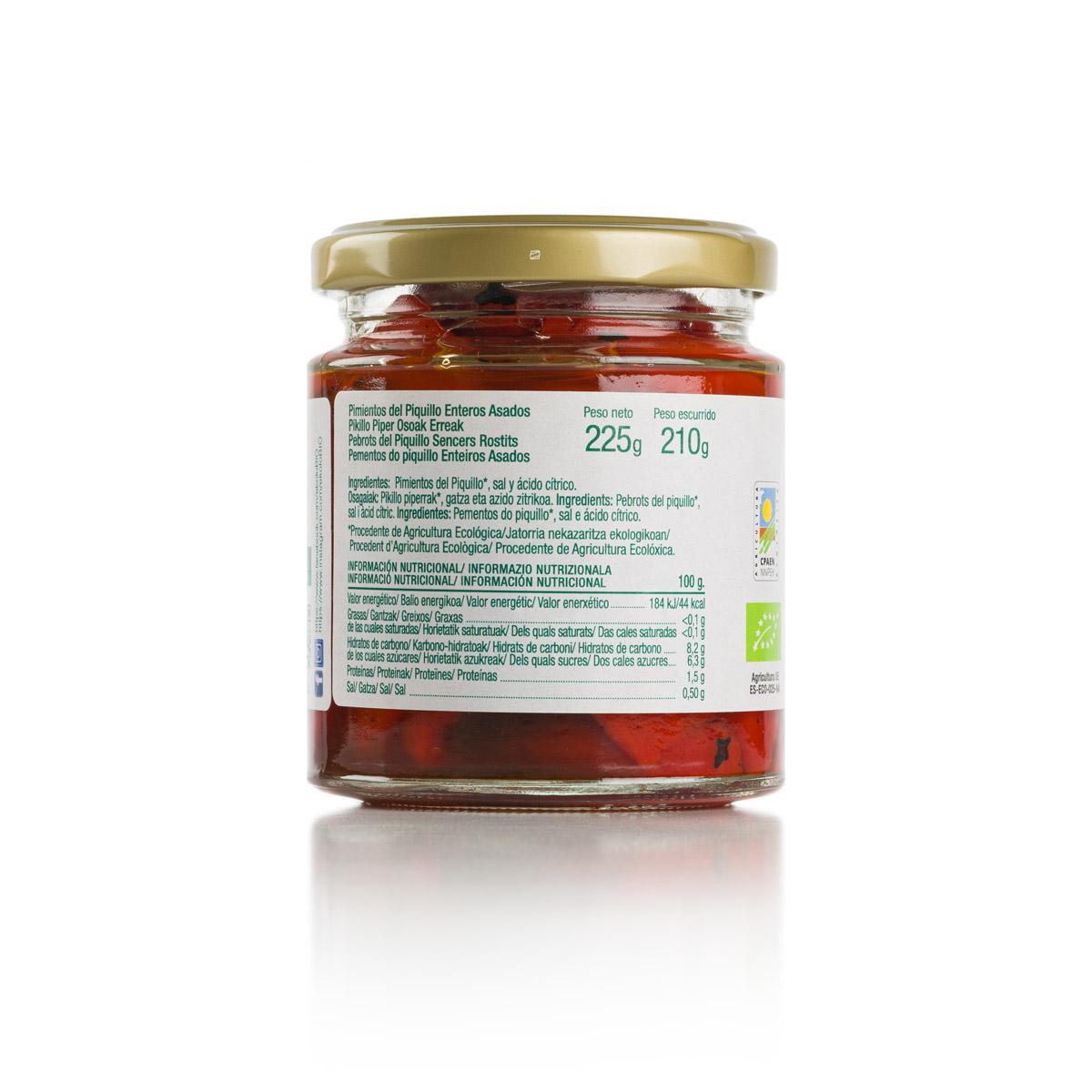 Ingredientes: Pimientos del Piquillo enteros de agricultura ecológica, sal y ácido cítrico (regulador de acidez).