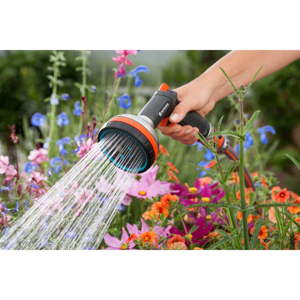 Pistola multifuncional Premium Gardena, ideal para regar parterres, macetas y plantas delicadas, además de tareas de limpieza y desincrustar suciedad.