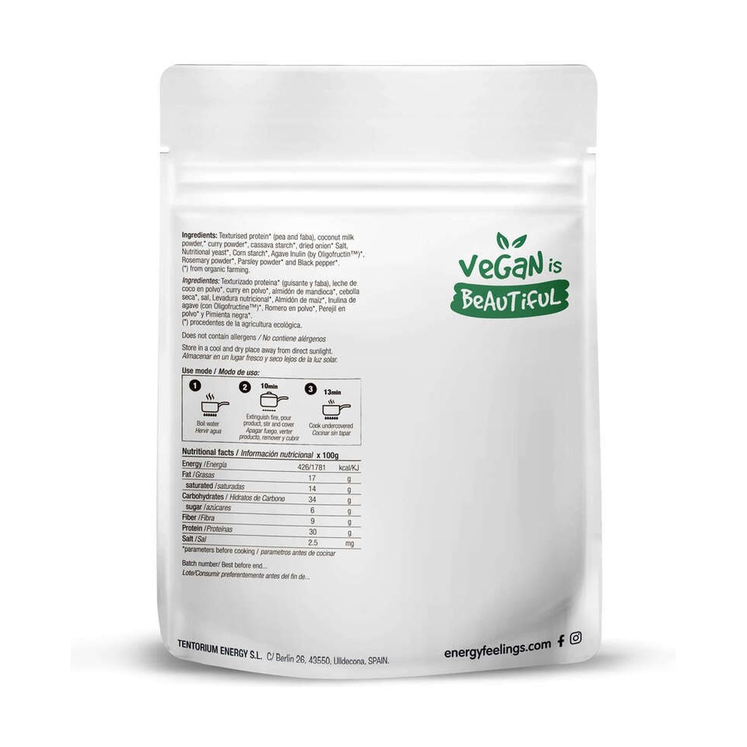 El preparado en polvo de pollo vegano al curry de Energy Feelings es un producto con alto valor nutricional y un sabor delicioso. Preparado elaborado con proteína texturizada de guisante y faba, leche de coco en polvo, curry en polvo, almidón de mandioca, cebolla seca, sal, levadura nutricional, almidón de maíz, inulina de agave, romero y perejil en polvo y pimienta negra. Preparado para Pollo Vegano Ecológico, ya que sus ingredientes son procedentes de agricultura ecológica. Se trata de una versión del pollo al curry proteica, ya que aporta alrededor de un 30% de proteína de origen vegetal. Tiene un color amarillo claro (color crema) y un ligero olor a curry. Se trata de una alternativa más saludable respecto al pollo tradicional, que incluye proteína de origen animal, siendo nuestra receta mucho más sostenible y con un proceso de producción sencillo y libre de químicos.
