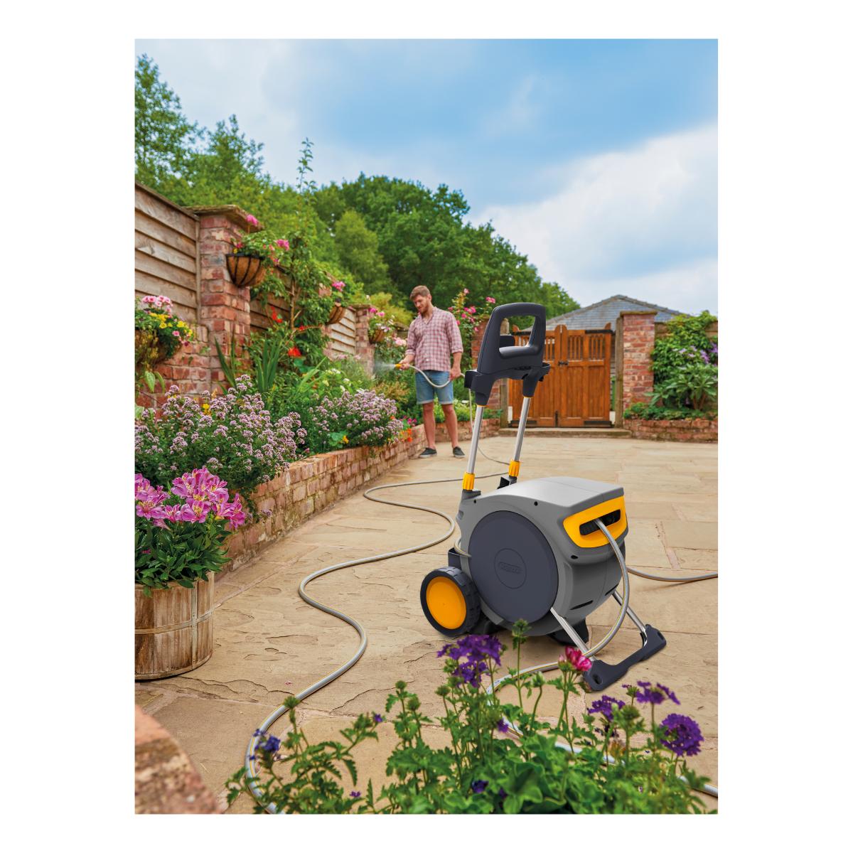 - Práctico diseño con ruedas – es ideal para jardineros que necesitan un enrollador automático pero prefieren no fijar la unidad permanentemente en un lugar.