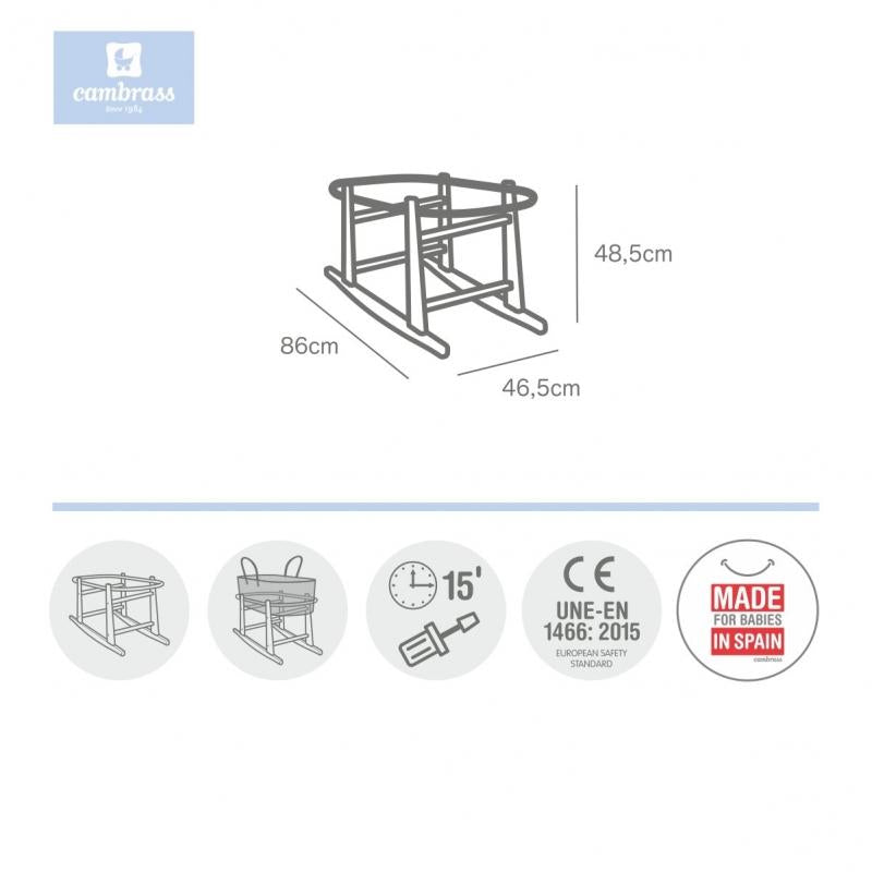 Está fabricado en madera natural, su altura permite la visibilidad del bebé por parte del adulto en todo momento o bien desde la cama. Tiene función de Balancin para facilitar el sueño de los bebes.