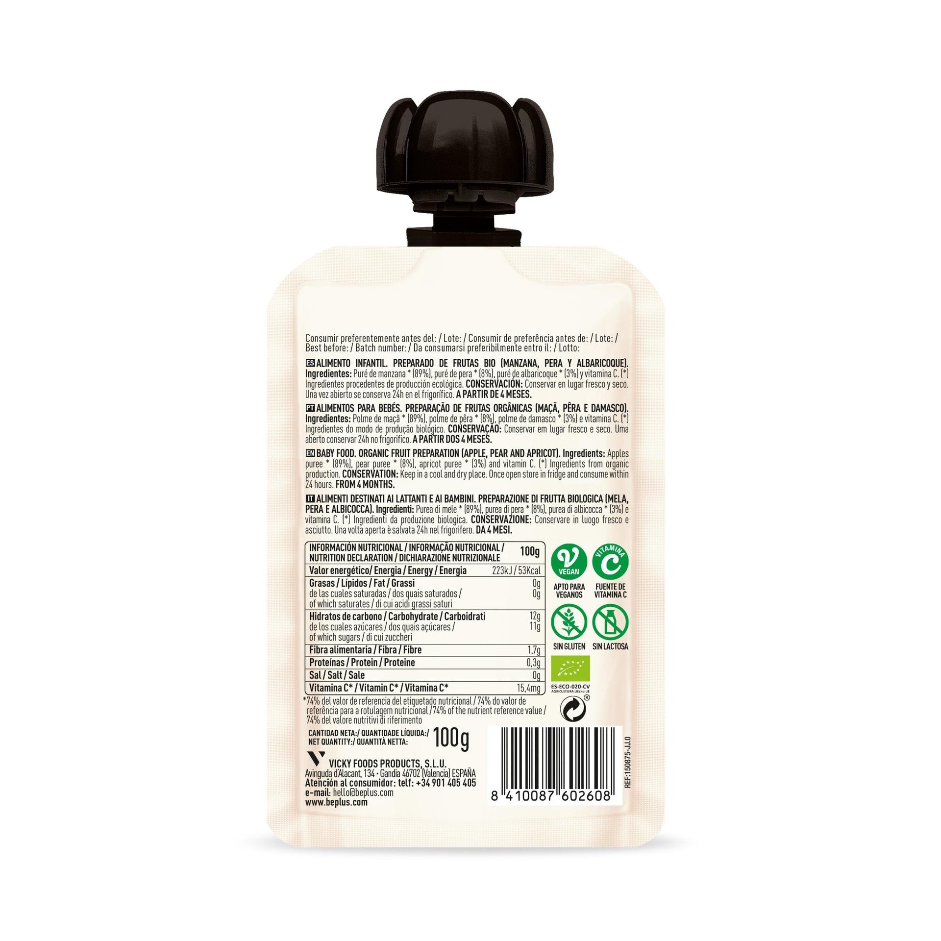 Toda la información sobre "Pouch manzana, pera y albaricoque BIO Be Plus 100 g"