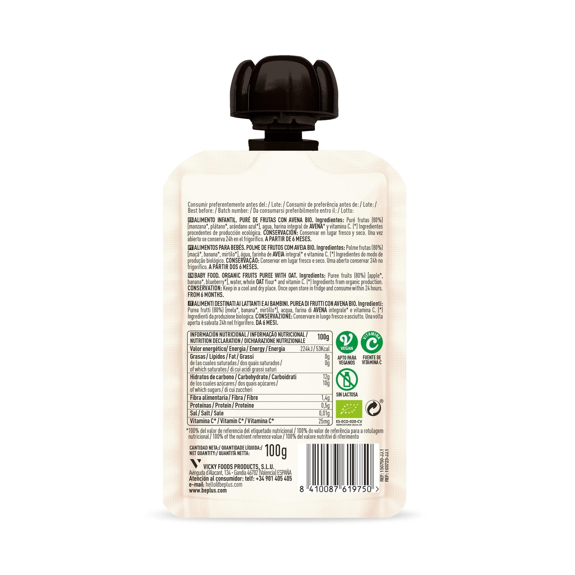 Puré frutas (80%) [manzana *, plátano *, arándano azul *], agua, harina integral de AVENA* y vitamina C. (*) Ingredientes procedentes de producción ecológica.