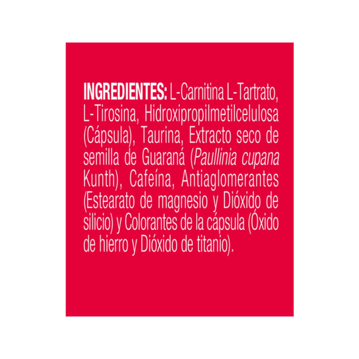 Agua desmineralizada, Fructosa, L-Carnitina, Extracto seco de guaraná (Paullinia cupana, semilla), L-tirosina(aminoácido), Taurina, Acidulante: Ác. cítrico, Cafeína, Sorbato potásico (conservante), Aroma de limón.