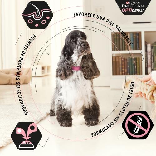 PURINA® PRO PLAN® Medium Adult sensitive skin con OPTIDERMA® rico en salmón es un alimento seco completo para perros de raza mediana con la piel sensible.