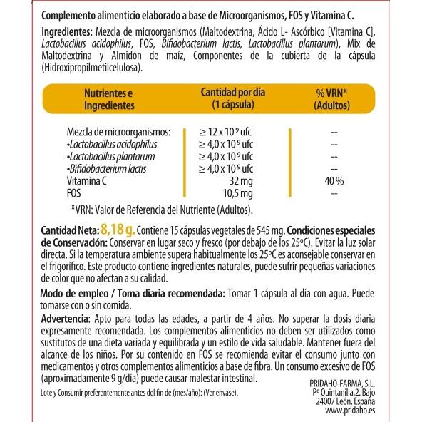 Mezcla de microrganismos (Maltodextrina, Acido l-ascórbico (Vitamina C) Lactobacillus acidophilus, FOS, Bifidobacterium lasctis, Lactobacillus plantarum), Mix de Maltodextrina y Almidón de maíz, Componentes de la cubierta de la capsula. (Hidroxipropilmetilcelulosa).