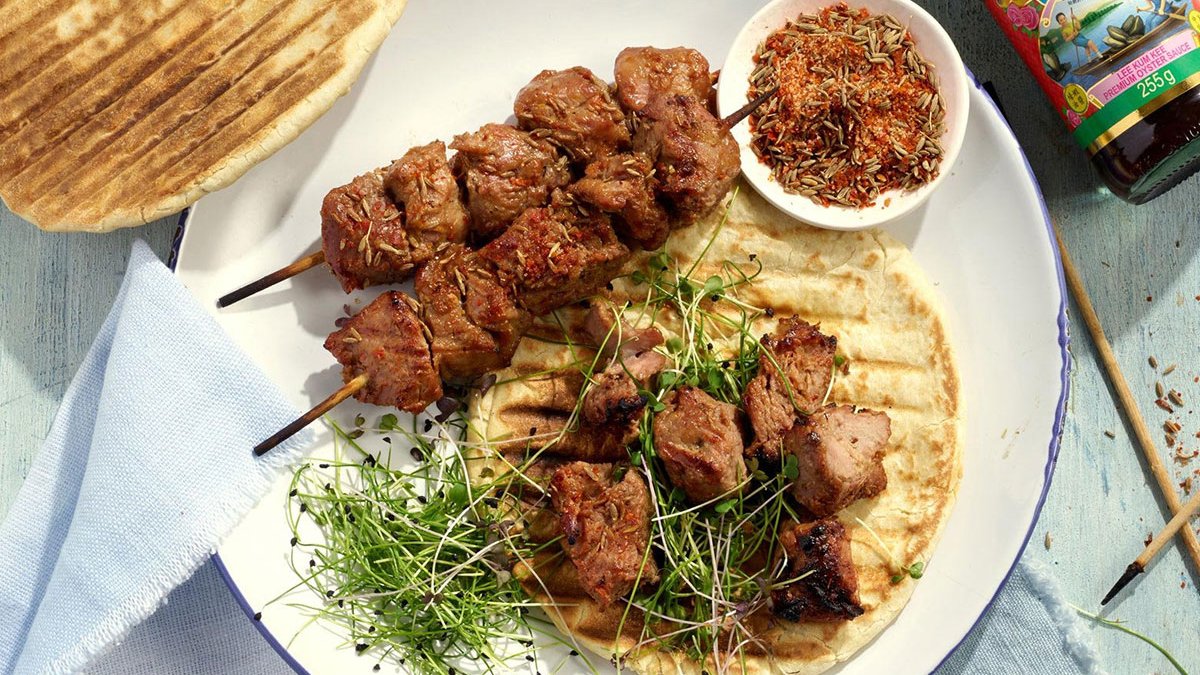 - Corta el cordero en cubos de 3cm. Mezcla los ingredientes del marinado en un tazón grande, añade los cubos de cordero y mezcla hasta que estén bien cubiertos. Cubre y deja marinar durante al menos 2 horas o toda la noche.