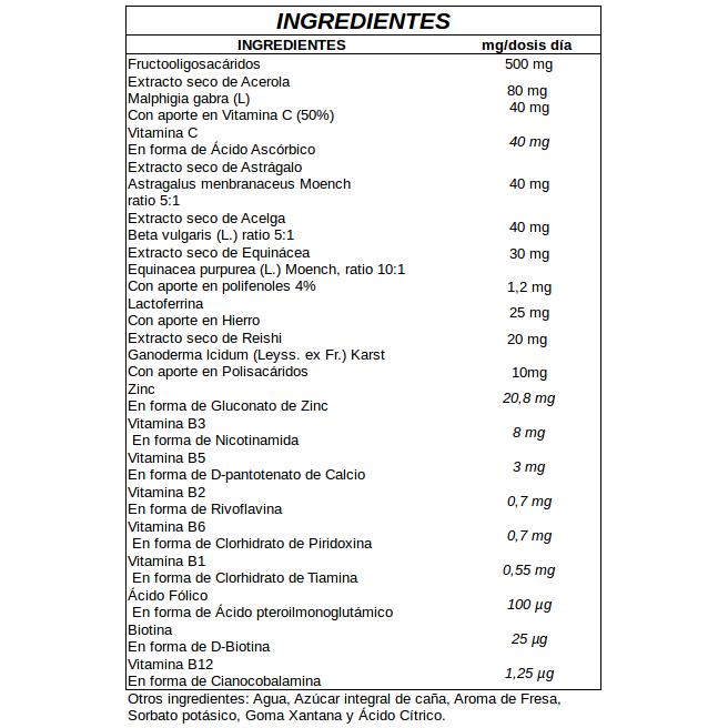 Producto a base de Extractos Vegetales estandarizados de Acerola, Equinácea, Acelga, Reishi y Astrágalo. Gracias a su contenido en Vitaminas C, B6, B12 y Zinc contribuye al funcionamiento normal del sistema inmunitario.