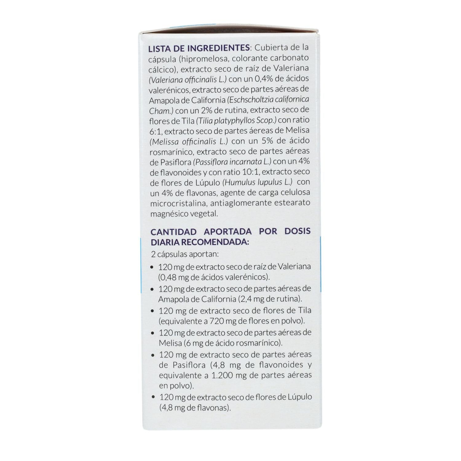 Cubierta de la cápsula (hipromelosa, colorante carbonato cálcico), extracto seco de raíz de Valeriana (Valeriana officinalis L.) con un 0,4% de ácidos valerénicos, extracto seco de partes aéreas de Amapola de California (Eschscholtzia californica Cham.) con un 2% de rutina, extracto seco de flores de Tila (Tilia platyphyllos Scop.) con ratio 6:1, extracto seco de partes áereas de Melisa (Melissa offcinalis L.) con un 5% de ácido rosmarínico, extracto seco de partes aéreas de Pasiflora (Passiflora incarnata L.) con un 4% de flavonoides y con ratio 10:1, extracto seco de flores de Lúpulo (Humulus lupulus L.) con un 4% de flavonas, agente de carga celulosa microcristalina, antiaglomerante estearato magnésico vegetal.
