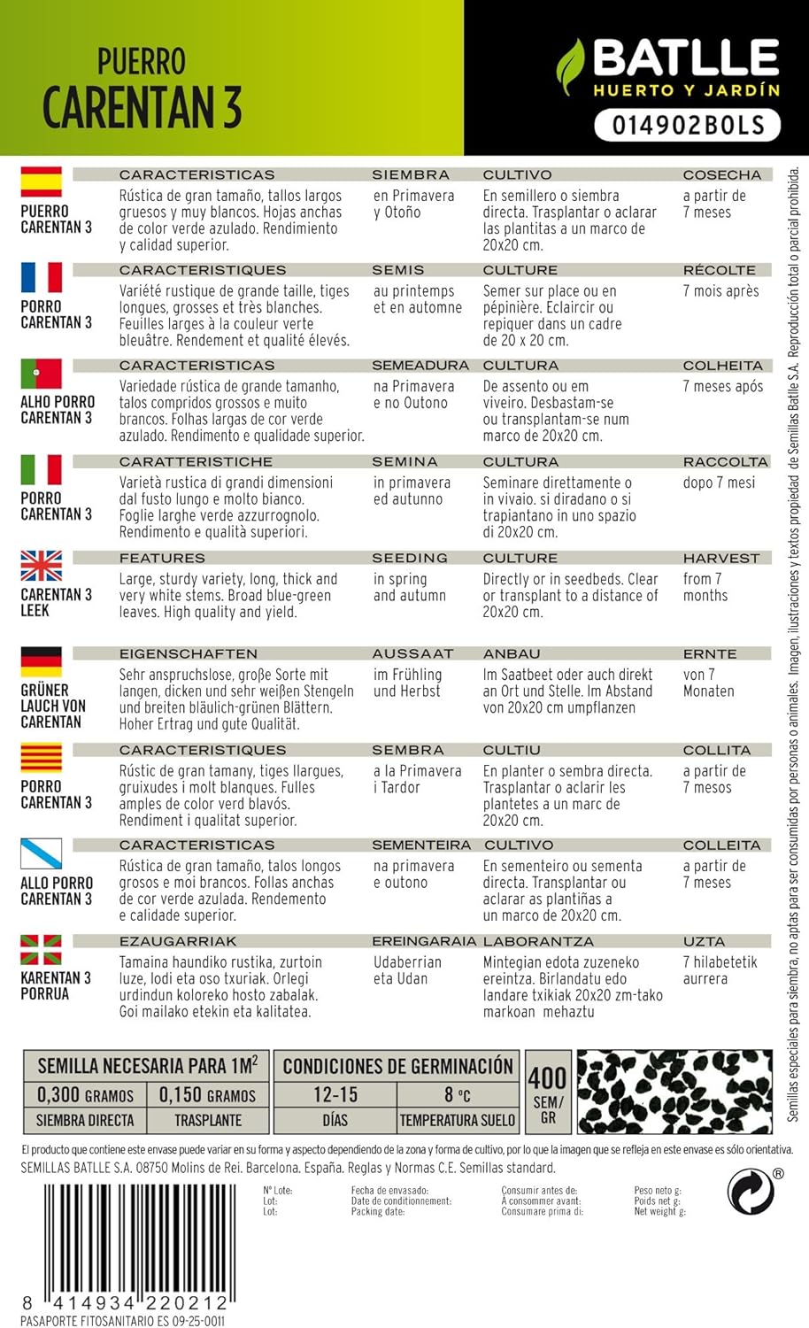Toda la información sobre "Semillas de Puerro grueso Carentan 3 Batlle"