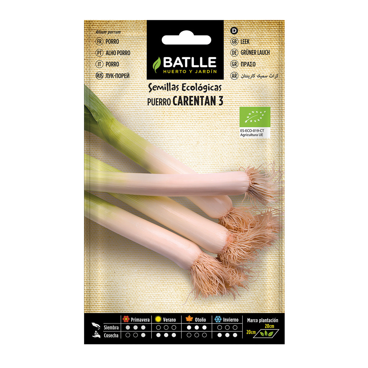 Semillas ecológicas de puerro grueso Carentan 3 de la marca Batlle. Hortaliza de tallo blanco y grueso, muy apreciada en la cocina por su sabor suave y versatilidad. Perfecta para huerto urbano o tradicional y para disfrutar de puerros frescos y saludables en casa.