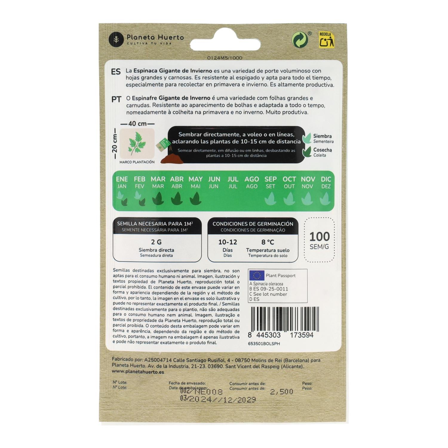 Toda la información sobre "Semillas de Espinaca gigante de invierno ecológicas Planeta Huerto"