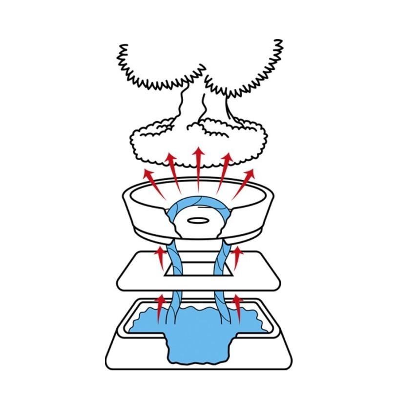 El depósito de agua de HIDROBONSAI suministra lentamente agua al bonsái por un sistema de capilaridad, lo que permite regar solamente una vez cada 10 o 30 días, según especie y tamaño de la maceta.