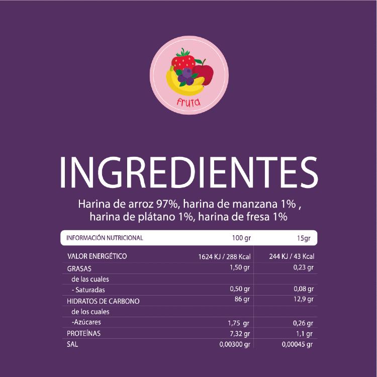 - Harina de arroz orgánico 9%, harina de fresa 1%, harina de manzana 1 %, harina de plátano 1%.