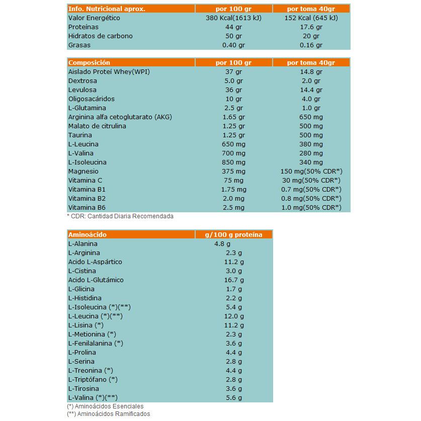 Aporte de aislado de Proteína de suero lácteo con Hidratos de carbono. Aminoácidos Ramificados, L-GLutamina, AKG, Malato de Citrulina, Magnesio y Vitaminas para la RECUPERACION del esfuerzo.